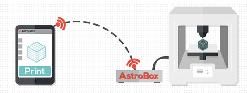You saw Drew mention the AstroBox. The software is great, but this is the key element. You still plug your printer in, but now you’re plugging it into a Wi-Fi router that both stores your data and allows you to connect to your printer from any location with web access. Once the gcode is compiled and the print has started, no web connection is needed unless you need to monitor or adjust the settings of your printer through the AstroPrint software.