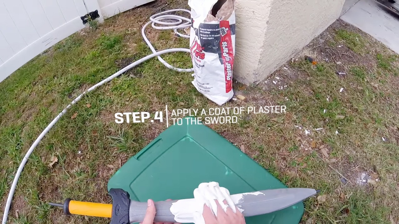 Kevin begins the build by using a toy foam sword as a mold to cast into aluminum, which he does by first inserting a steel pipe into the sword (for rigidity) and then encasing it in plaster. Once dry, he then puts it into a bucket of sand to keep it level (and reducing the chance setting his surroundings on fire). Afterwards, he pours molten aluminum into the hollow end of the foam sword, which burns away the foam leaving only the cast aluminum with steel rod inside.