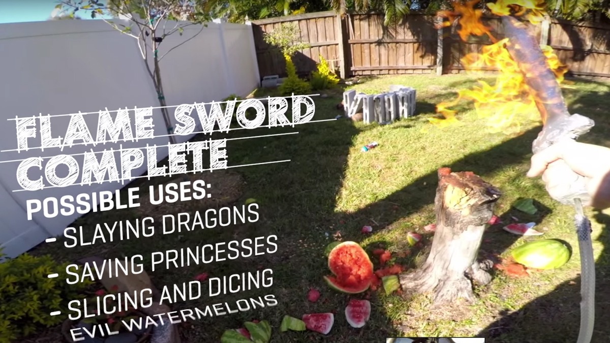 Kevin Kohler, aka The Backyard Scientist, is widely known for his unique experiments and projects that often result in something exploding, melting or being burned, which applies for one of his more recent projects–the Flame Sword. As the title suggests, the sword is literally ENGULFED IN FLAMES as Kevin uses it to mutilate a perfectly delicious looking watermelon.