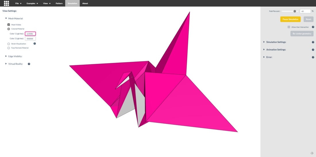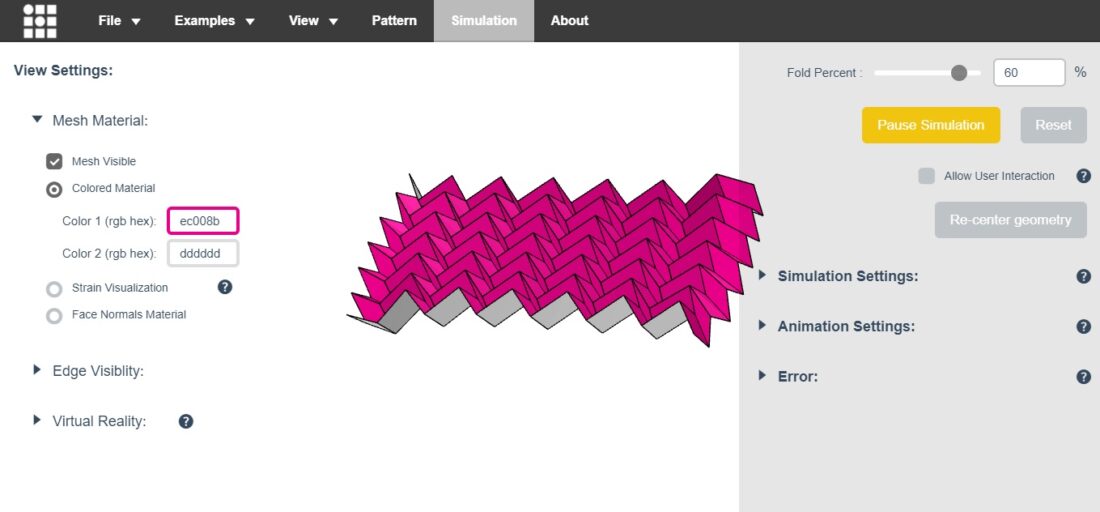 Users can upload their SVG or FOLD patterns, or use one of the pre-existing examples. After choosing one, you can move its simulation around and adjust aspects such as the fold percentage, edge visibility, and pattern stiffness. It isn’t a video game, but it does have VR headset and hand controller capabilities which let you interact with the pattern in a digital construct.
