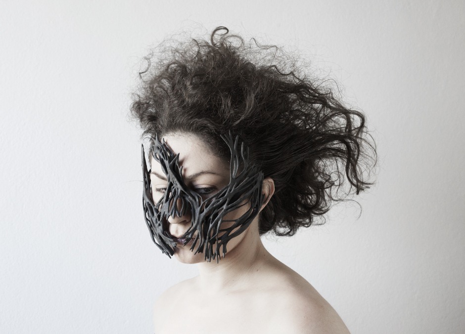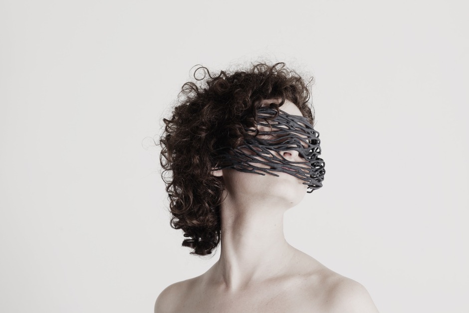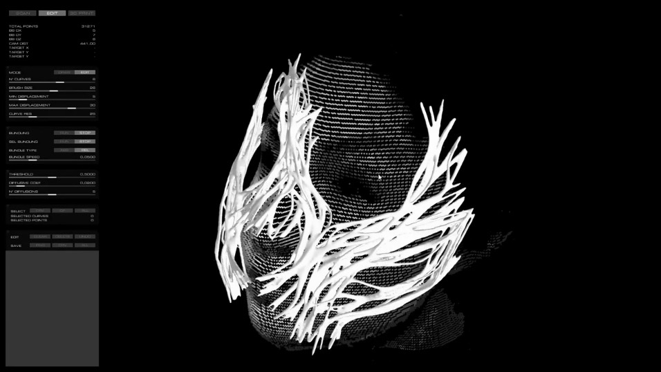 DO THE MUTATION is a two person generative deisgn lab near Modena, Italy. Founders, Filippo Nassetti and Alessandro Zomparelli worked in collaboration with EDGELAB S space and form strategies to realize the mask concept. The COLLAGENE software application itself is written in Processing, a opensource framework based on Java, and uses the Toxiclibs libraries to generate the isosurface. The topographic and chromatic data of the face is first captured with a Kinect, then paths are drawn across the imported data to simulate the formation of a fiber system growing across the face.