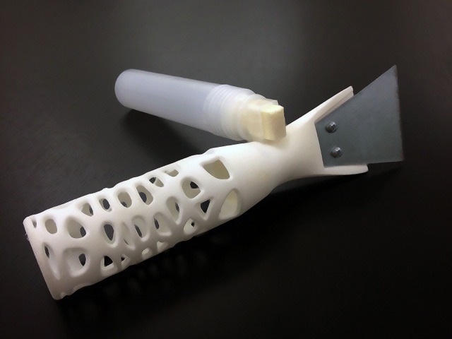 The gMax Kickstarter campaign has already raced by their $50K goal, so they’re now offering a new stretch goal – the Makeraser (Makeraser.com). The Makeraser is an all-in-one tool that will come with every gMax printer (if they hit $100k – currently at $96K). The sleek steel blade is thin enough that removing prints is no problem. Within the handle is a felt marker containing a mix of acetone and ABS, perfect for smoothing 3D prints as well as ‘stickifying’ the print bed and gluing larger prints together. To top it off, it’s art incarnate! (Blessed be Voronoi filtering algorithms to generate a beautiful organic handle!).