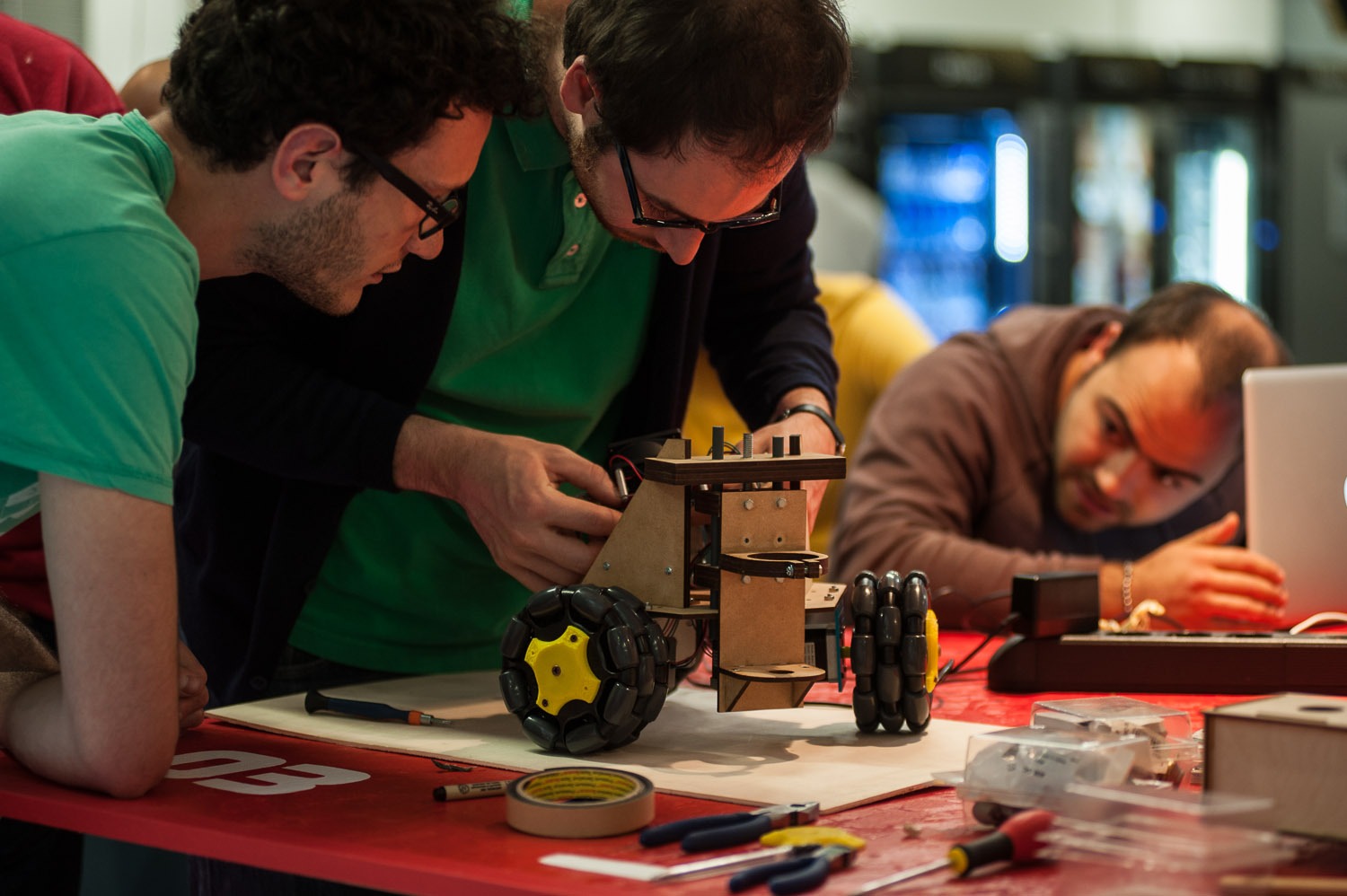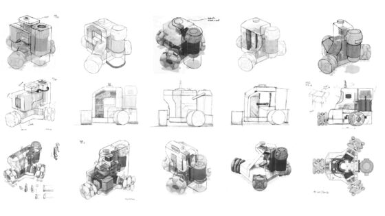 The project went through three iterations before reaching a final design. The first prototype was largely composed of wood and built to show the feasibility of a portable, sensor-based CNC machine. Even at this stage, even the wheel design was quite established, starting as an omnidirectional three-module design.