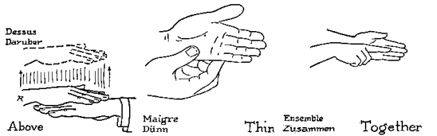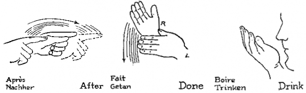 - First, point to yourself and perform this gesture, letting them know you are going to explain something to them. (Hold extended right hand, back down, in front of, close to, and little lower than mouth, fingers pointing to left; by wrist action move hand outwards a few inches. To be spoken to or explained to, reverse the action, moving hand towards face.)