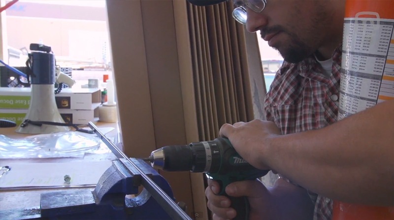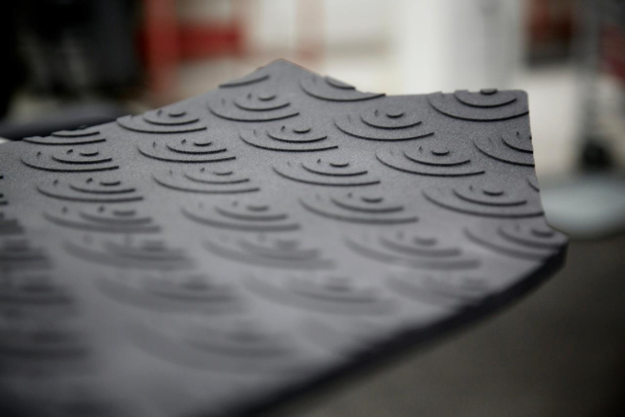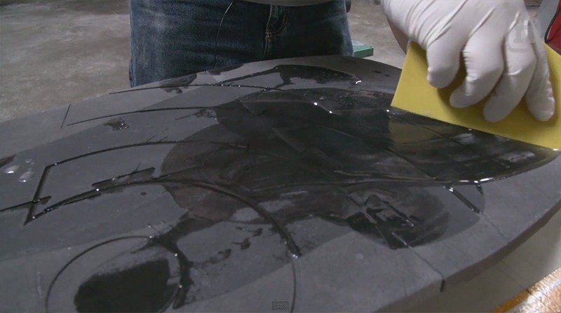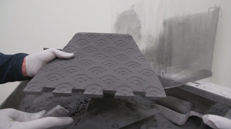 The pieces were then positioned in the print software and sintered using carbon power in an Objet500 Connex 3D Printer. The pieces were dusted, snapped together and the entire board coated in resin. After applying the resin and vacuum bagging, they let it cure for 9 hours. The results were very flimsy, so to reinforce it, they applied three metal reinforcement straps down the length of the board.