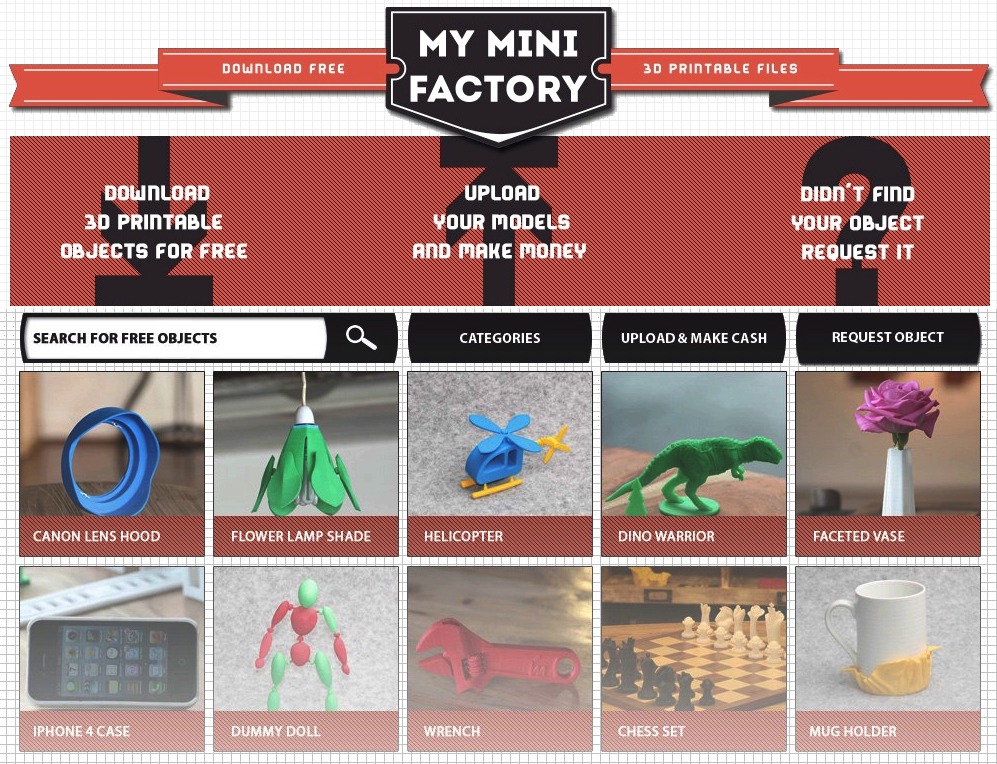 Raise of filament rolls in the room–who thinks they can open up a website that allows you to 1) download 3D printable files and 2) upload your own to make some cold, hard cash? I know, you’re thinking, “Egad, what is this genius!? The like has yet been seen!” The reality is there are a lot of websites to both download, upload and share 3D printable files (GrabCAD, Thingiverse, etsy, FabFabbers, etc.) or even sell your creations (Shapeways, Ponoko, Sculpteo, Etsy, etc.), yet a new site is launching with the aim of “becoming the YouTube of 3D files.” iMakr has announced the launch of My Mini Factory coming June 18th (with a Champagne and Canapés launch party at the iMakr store). So, how are they different?