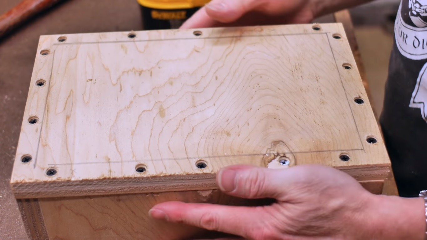 After sanding and assembling all the sides, he marks the bottom with a pencil border as a point of reference. To connect this final piece, Eric drills an ungodly number of screws into the underside of the mold box, using the pencil border as a guide. While you could get away with using fewer screws, Eric states it’s better to be safe than sorry; at least you’ll be sure the box won’t leak or suddenly break down!