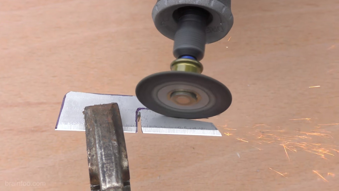 Using a small printout of a cleaver as the basis for the build, Brainfoo cuts a Stanley blade and fits it into the shape of the knife. He extends the metal of the blade for it to fit inside the handle.