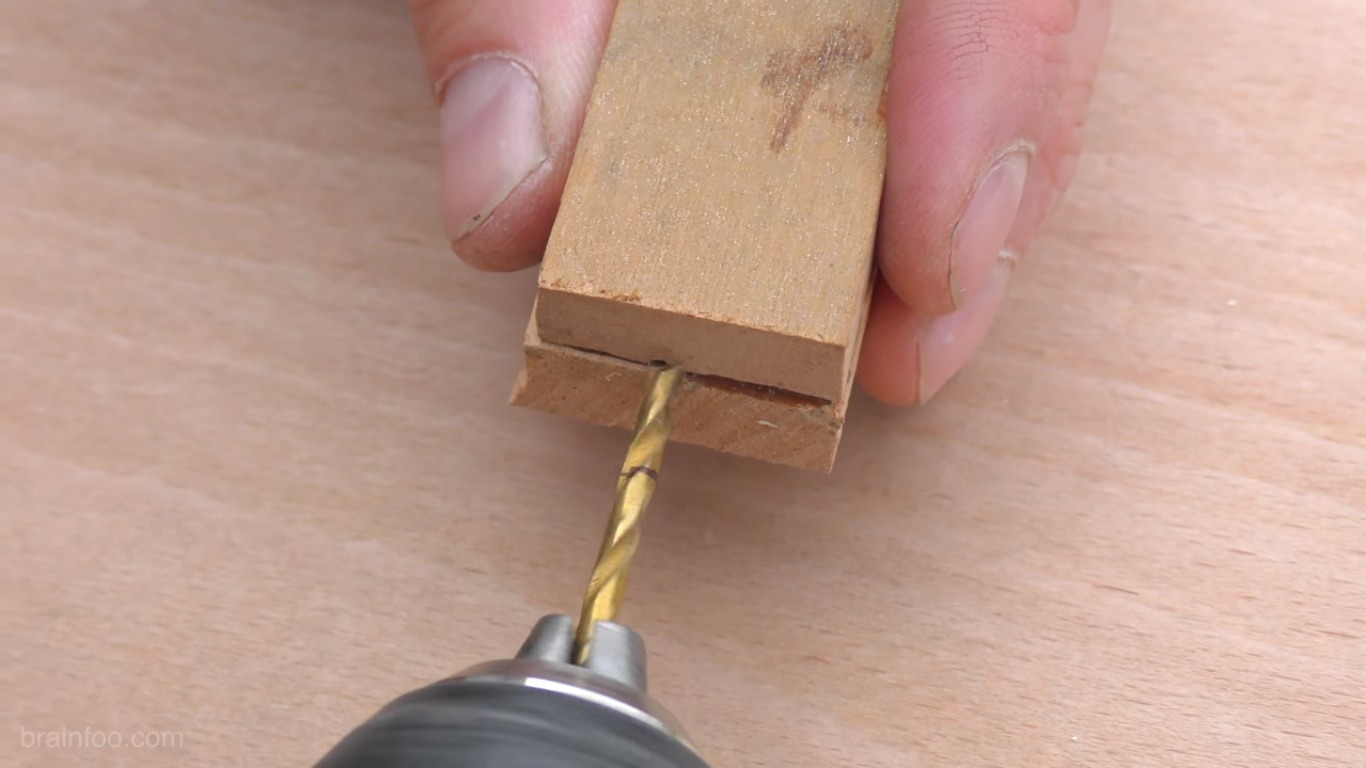 The last part of this tiny build is a fridge magnet protector for the blade. Brainfoo cuts a sheathe onto a small block of wood and leaves just enough space for a magnet to be inserted. He also makes a small groove which serves as a guide for when he drills a hole for the magnet to fit into.