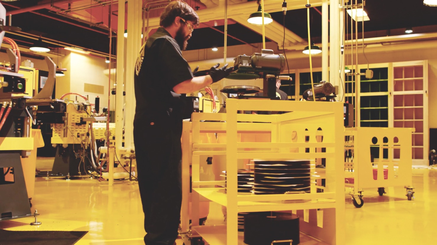 Similar to Krispy Kreme Doughnuts, the facility offers a full transparent viewing window for audiophiles (or soon-to-be audiophiles) to watch each stage of the vinyl pressing process ahead of picking up their very own copy of whatever is being pressed that day.