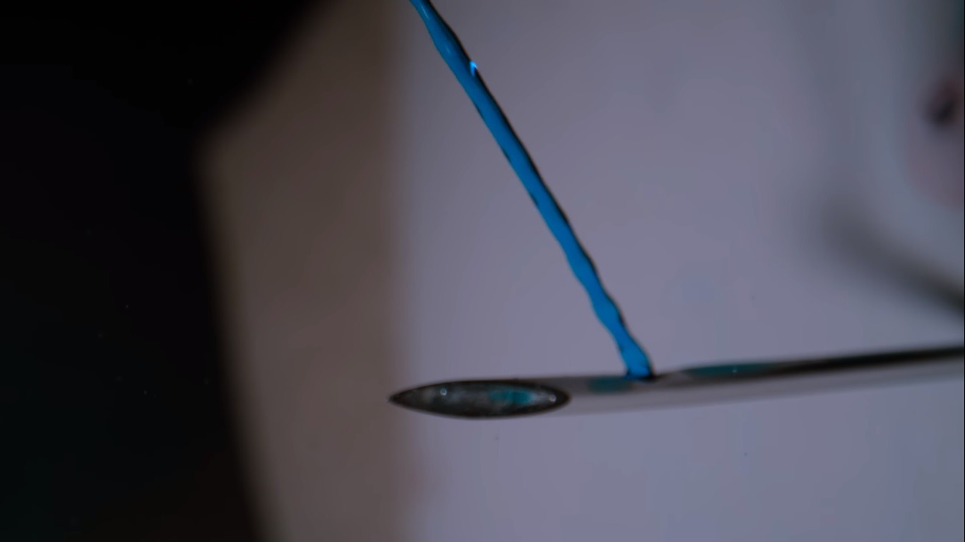 Gav and Dan conduct one final experiment, this time with a water balloon on the exit point of the faux leather to mimic the blood inside a living animal. They should have really gone with a more organic container, as the balloon pops before we can properly see the food coloring mix with the water. But thanks to the power of slow motion, we can catch a small section of water near the dart’s entry point which turns a lighter shade of blue before it pours down to a container below.