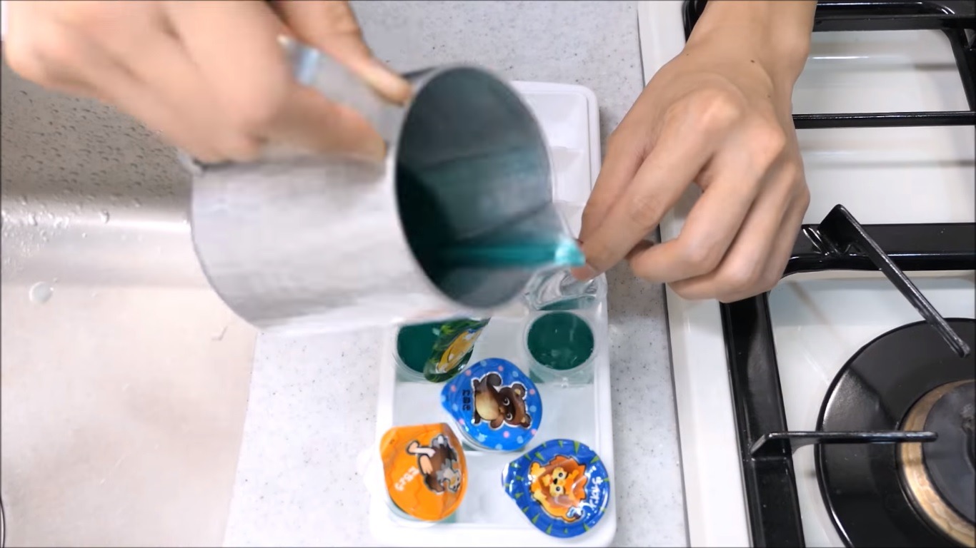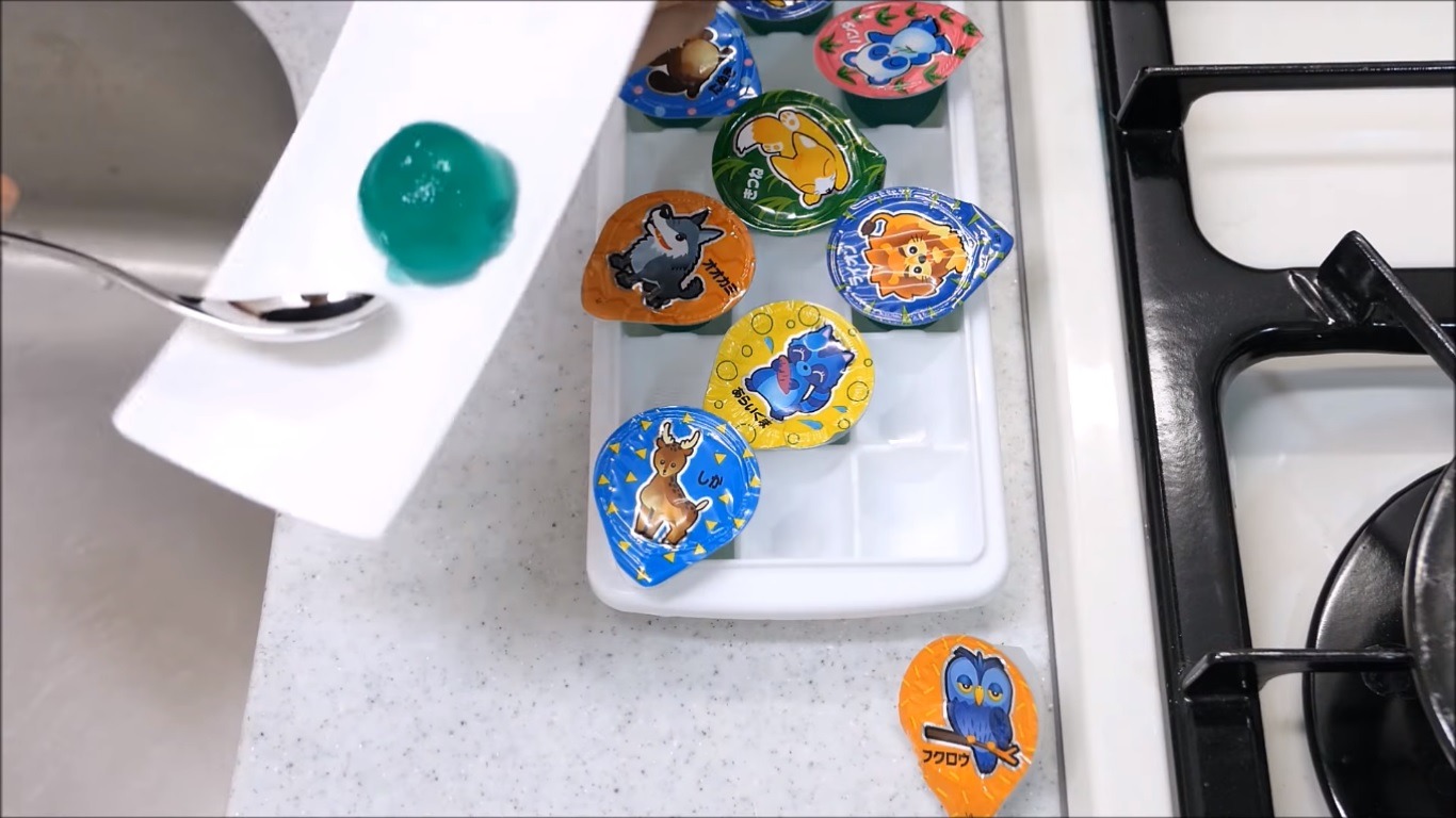 Unlike cardboard, which has at least a little bit of hardness property to it, jelly has almost no solid properties. Unless frozen, even a baby could tear it apart with its soft hands. So it’s amusing to see kiwami do the exact opposite and melt many jellies into a fine liquid. To keep the mixture’s color uniform, he adds a bit of food coloring.