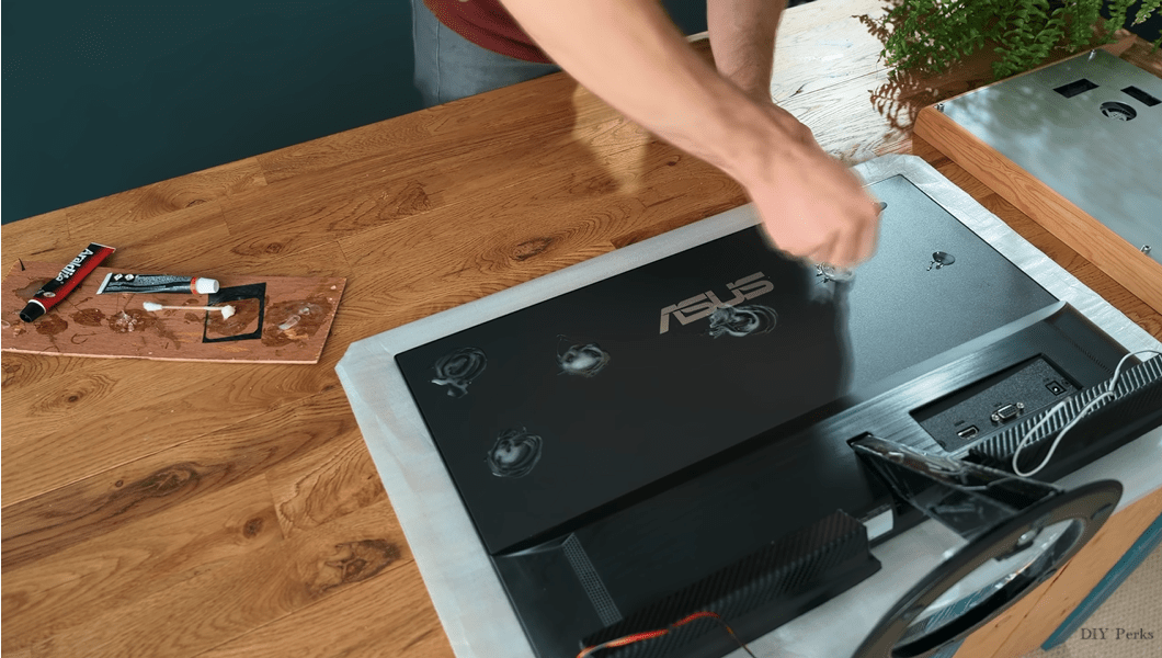 Being satisfied that the component parts fire up and are configurable its time to build the new housing or chassis to contain everything. First up is to select an appropriate monitor. This build called for an Asus VZ249HE 23.8″ owing to its thin, low profile housing. Matt chose a combination of MDF fiberboard, solid wood, aluminum, and some faux carbon fiber sheeting as his Color Material Finish (CMF) pallet.