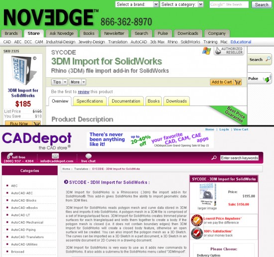 Like Novedge, CAD Depot carries products which are generally not sold through resellers, however you do have some options like Alibre Design Expert which Novedge lists for $945 and CAD Depot lists for… well, they don’t list it. They do the super secret deal thing and tell you to Call for Price. But, if we do look for something they both sell… oh, let’s say, a “3D Import for SolidWorks” translator from SYCODE, which you can buy (without subscription) from SYCODE for $195.