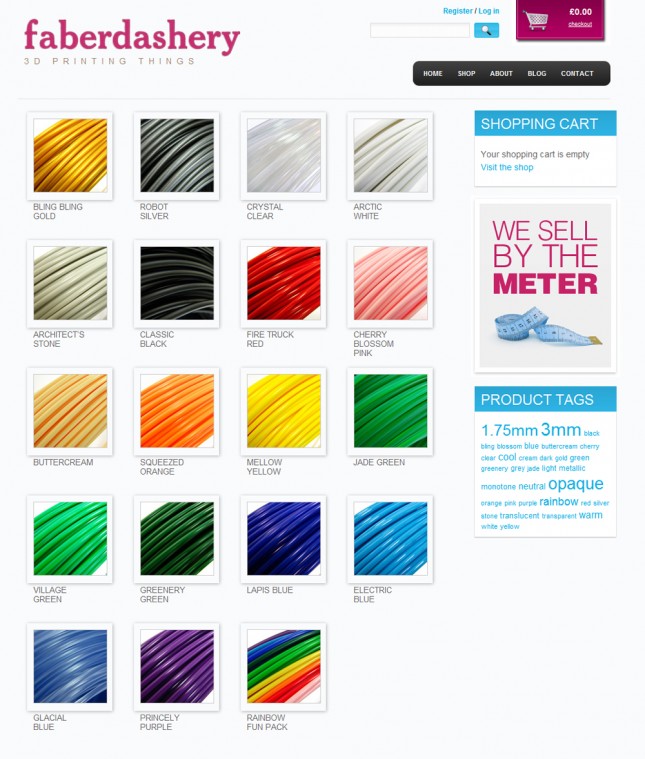 3D printing things indeed! This new startup, hailing from the UK, is bringing the fab to fabulous with a whole array of 3D printing filament in sizes ranging from 1.75mm to 3mm by meter or coil. They’ll shock your extruders with a variety of colors including clear, gold, silver, squeezed orange, electric blue and buttercream… BUTTERCREAM!