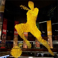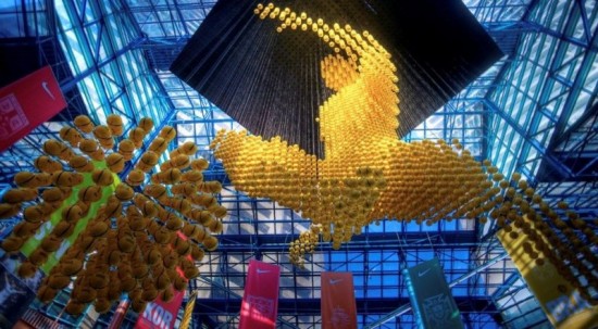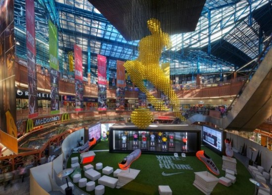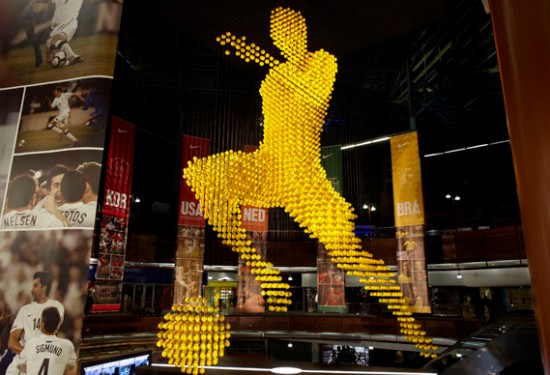 Nike strung the massive structure from the ceiling of the Carlton Centre atrium in Johannesburg, South Africa for the last few weeks of the FIFA Worldcup. Designed by Ratcliffe Fowler Design, it used 5,500 footballs, is 21 meters high, uses over 6 miles of cable and weighs a whopping 4.75 tons. After the final game, it will be dismantled and the balls given to the community.