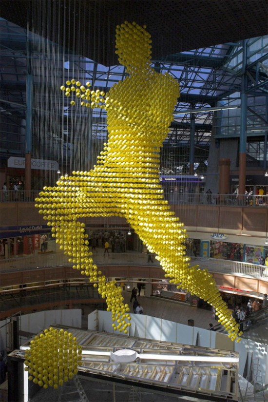 To make it they used the 3D scan of an athlete, then used the cable to attach and line up the balls in space. (Kinda like the kinetic sculpture at the BMW Museum.) It took three weeks to assemble the spheroid strung footballer. Here are the shots.