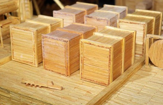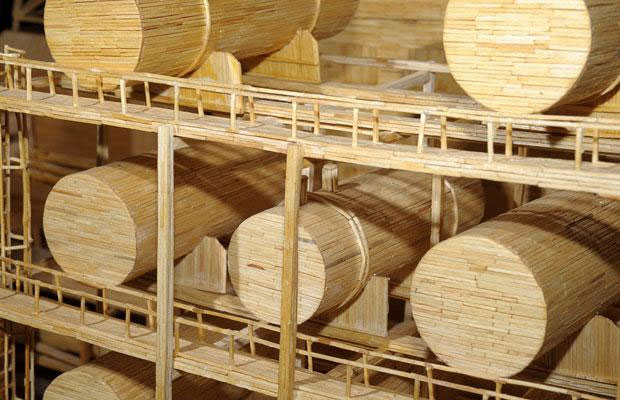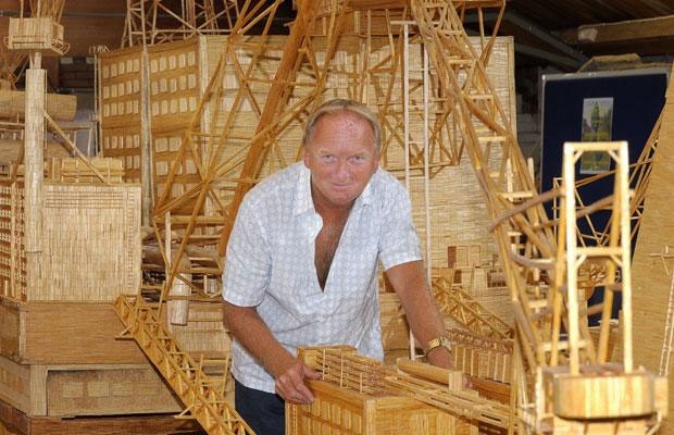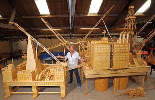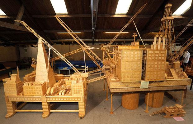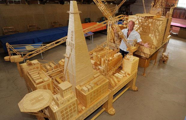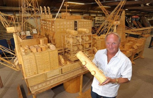 David, a former oil rig worker, glued each polished matchstick in place to create the half ton model of the Brent Bravo oil rig in his living room. It measures 21ft long, 12ft high and is probably one of the largest fire hazards this side of the International Date Line. More images after the break.